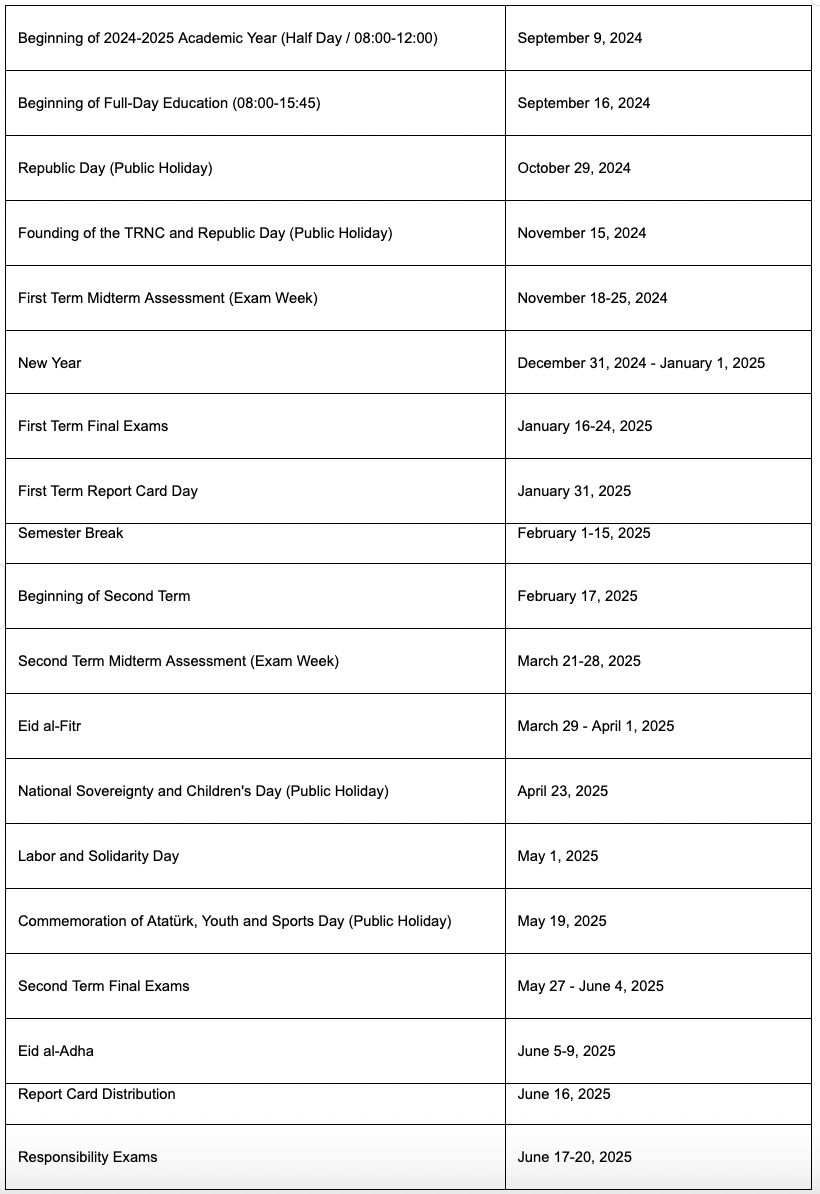 Our school will open its doors to students on September 9, 2024. During the first week, students will be accepted starting at 7:30 AM, and classes will continue until 12:00 PM. On September 9, students will arrive at school with their families in the morning. Those registered for school transportation will return home by school bus. Starting from September 16, 2024, the school will transition to full-day education, with school ending at 3:45 PM.