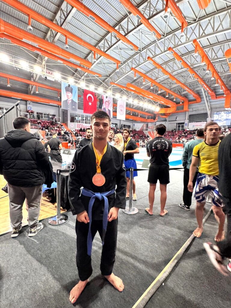 Competing against Ukrainian, Turkish, Russian, and Dagestani opponents at the 2025 AJP Tour Turkey National Jiu-Jitsu Championship, 15-year-old Near East Sports Tower athlete Deniz Turan won the gold medal in the 66-kilogram youth men’s kimono (Gi) category and the silver medal in the no-kimono (No-Gi) category.