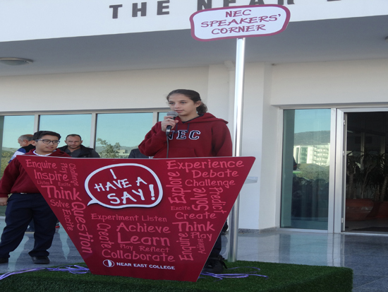 Headmaster Işılay Arkan, his Deputy Ömer Ozkan and Head of the English Department Lesley Hakseven on Thursday 6 November inaugurated the “NEC Speakers’ Corner”, proposed and designed by English teacher Gülten Sert Goker, acting on behalf of year 6 and year 7 students and their teachers.