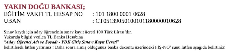 - Aday öğrencinin sınav kaydı için; Yakın Doğu Bankasının herhangi bir şubesine (aşağıda belirtilen hesap numarasına) 100 TL tutarındaki miktarı yatırması ve dekontla birlikte bir adet fotoğrafı gerekmektedir. (Fotoğraf, Sınav Giriş Kartına yapıştırılacaktır.)