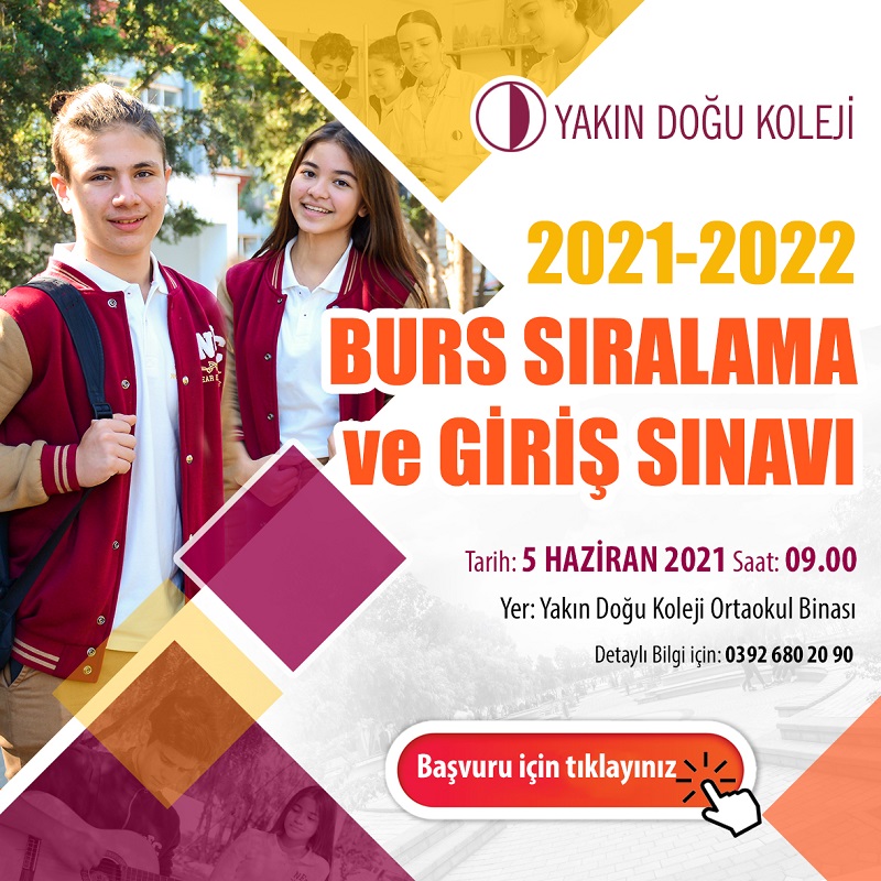 - 2021-2022 Burs Sıralama ve Giriş Sınavı 5 Haziran 2021 Cumartesi günü saat 09.00’da Lefkoşa Yakın Doğu Koleji, Dr. Suat Günsel Girne Koleji ve Yakın Doğu Yeniboğaziçi Koleji olmak üzere üç merkezde yapılacaktır.