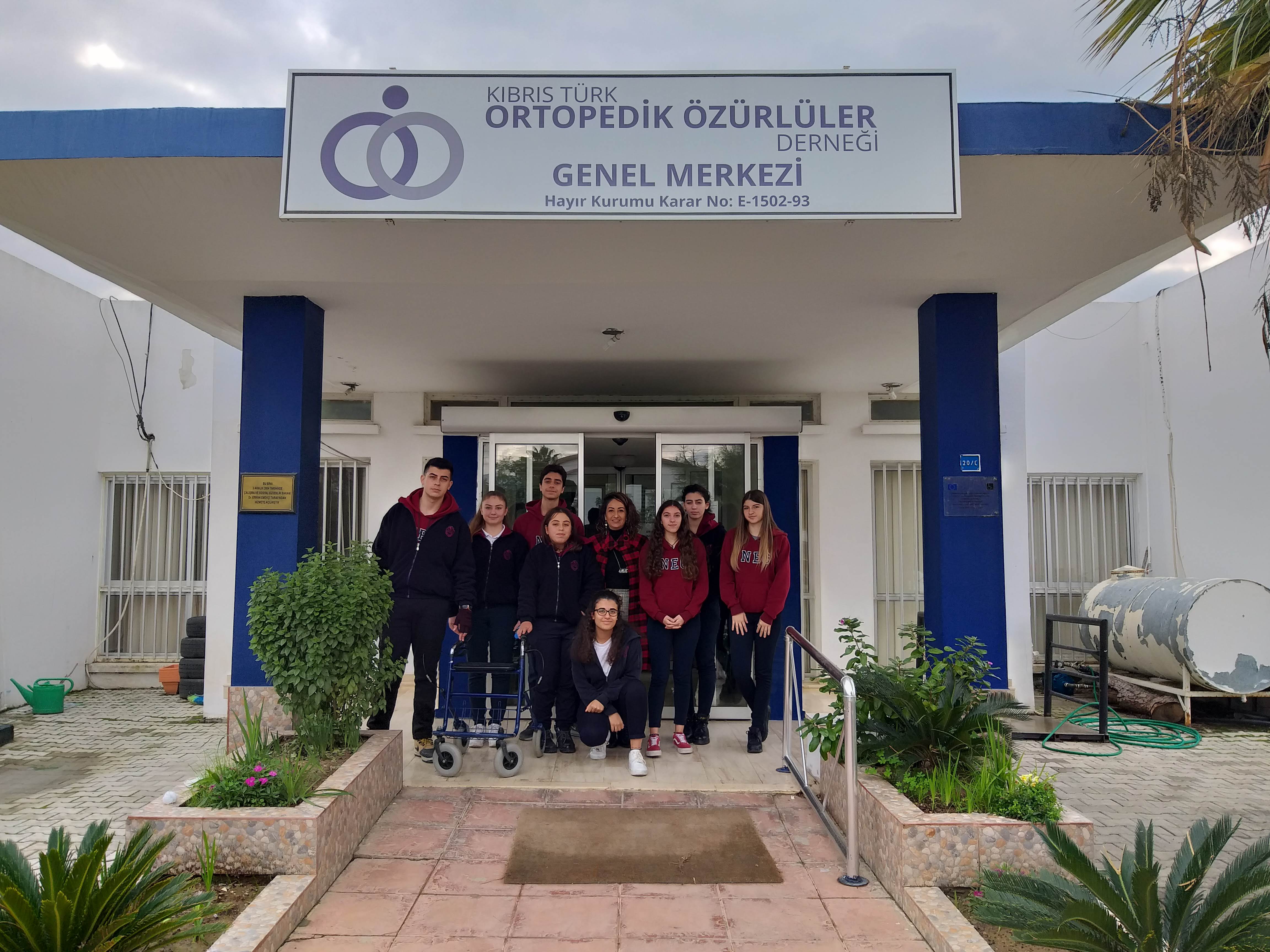 Lefkoşa’da bulunan dernek binasını ziyaret ederek bağışta bulunan öğrenciler dernek binasını gezerek derneğin işleyişi hakkında da bilgiler aldı. Dernek yetkilileri tarafından öğrencilere, derneğin misyonu gereği engelli vatandaşların toplum içerisinde eşit haklara sahip olarak var olabilmeleri adına mücadelelerinin sürdüğü anlatıldı. Engellilere yönelik yaptıkları çalışmaları anlatan yetkililer, ihtiyaç duyulan çalışmalar ile ilgili öğrencilerden fikirler aldı. Öğrenciler daha sonra dernek binasında faaliyet gösteren protez üretim birimindeki çalışmaları yerinde incelediler.